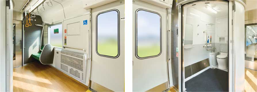 バリアフリー設備ガイドラインに対応した車内設備とし、車いすスペースおよび車いす対応トイレを設置しています。