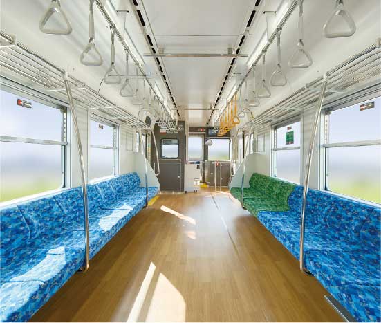客室内の床面は温もりを感じる木目調、壁面は明るく清潔感のある布地目にアクセントのグレーブラウンを組み合わせました。一般席の座席は外観と同じく四国の海や空をイメージしたブルーを基調に、光に照らされる煌めきを多様な色で表現、優先席は色覚の多様性に配慮したグリーンを採用し、四国の美しい山々をイメージした配色としました。