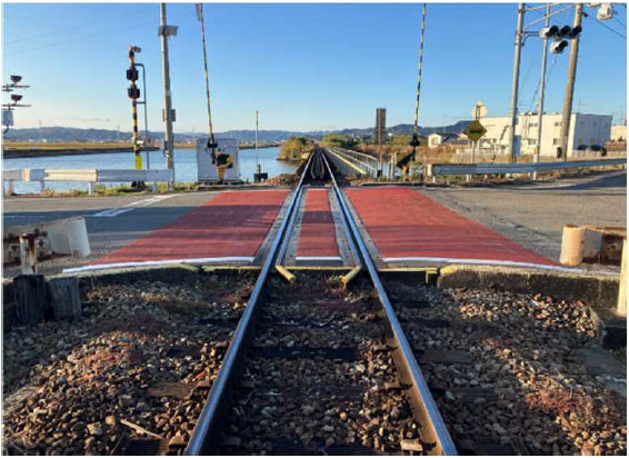 踏切内で閉じ込められ、事故に至るケースが多く見受けられることから、“踏切内「停車禁止」「歩行者・自転車滞留禁止」の意識付け及び踏切視認性向上”を目的に、ドライバーや歩行者・自転車に注意を促すため踏切内ペイント(レンガ色塗色)や3D路面標示を施行しており、2024年度は5箇所の踏切に施工しました。