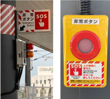 お客様の駅ホ-ムからの転落等による傷害事故を防止するため、2017年9月に予讃線坂出駅に、2024年9月に同松山駅に「非常ボタン」を設置しました。この装置は、急遽列車を停止させる必要が発生した場合、非常ボタンを扱うことにより、これに連動した非常報知灯が赤色点滅し、ホ-ム設置のパトライト(赤色灯及び扱った箇所の黄色灯)が点滅、関係列車に危険を警告する装置となっています。また、非常ボタンを扱った際には、ブザ-が鳴動し日本語と英語の音声案内が作動する装置となっています。