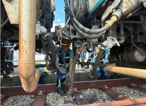 本四備讃線児島駅~宇多津駅間において、異常時における運転取扱い訓練を2024年10月に番の州高架橋上で実施しました。訓練では車両故障により走行できなくなった列車に対し、宇多津駅から救援列車を運転し、現地において特殊中間連結器を使用して異車種間での連結作業、またお客様対応を行うなど、異常時の対応能力向上に取り組みました。