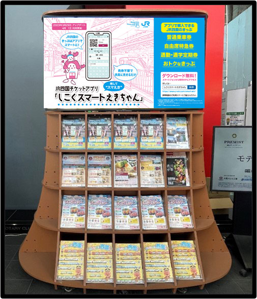 高松駅・松山駅・徳島駅・高知駅に設置している「パンフレットスタンド一体型デジタルサイネージ」の一部を有料広告媒体として販売開始しました。