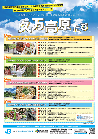 また、公共交通機関や町内事業者との連携により、久万高原町の魅力をより発信できる観光ツアー(旅行商品)の造成を行い、更なる集客と持続可能な旅行プランの構築を図った。