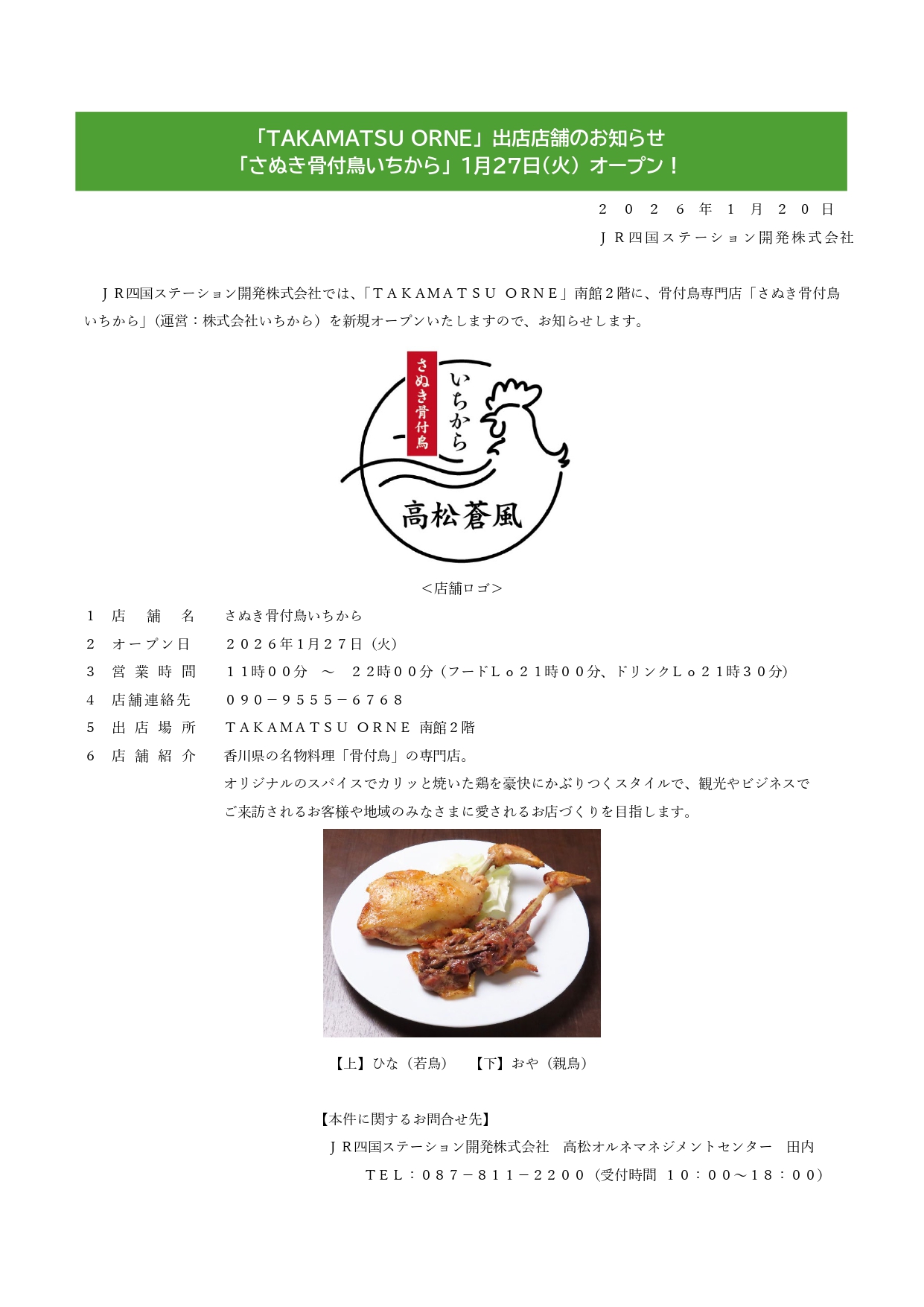 「TAKAMATSU ORNE」南館2階に、骨付鳥専門店「さぬき骨付鳥いちから」(運営:株式会社いちから)を新規オープンいたしますので、お知らせします。