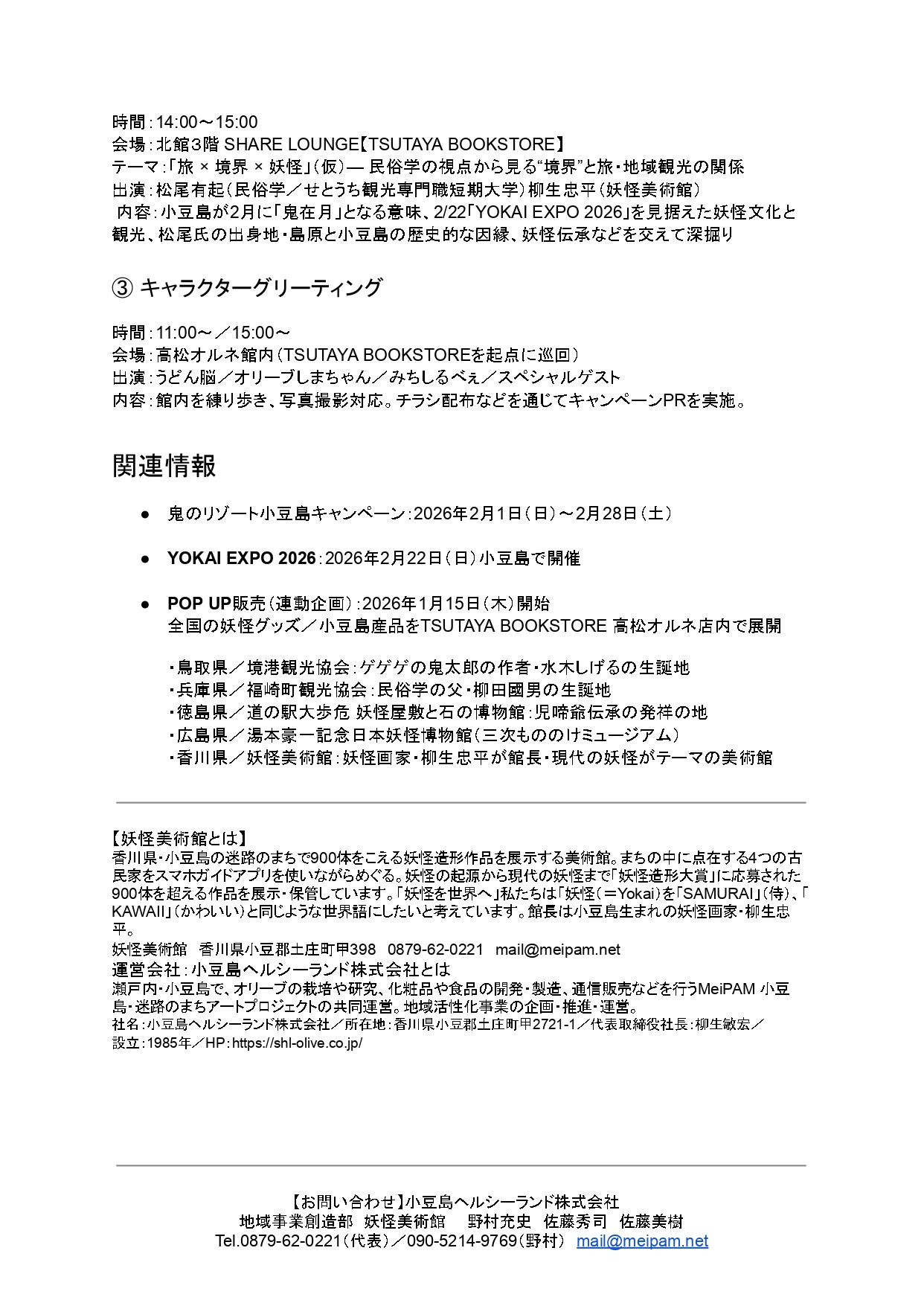 | 運営主催 | 小豆島観光協会/小豆島ヘルシーランド株式会社 地域事業創造部 妖怪美術館 |