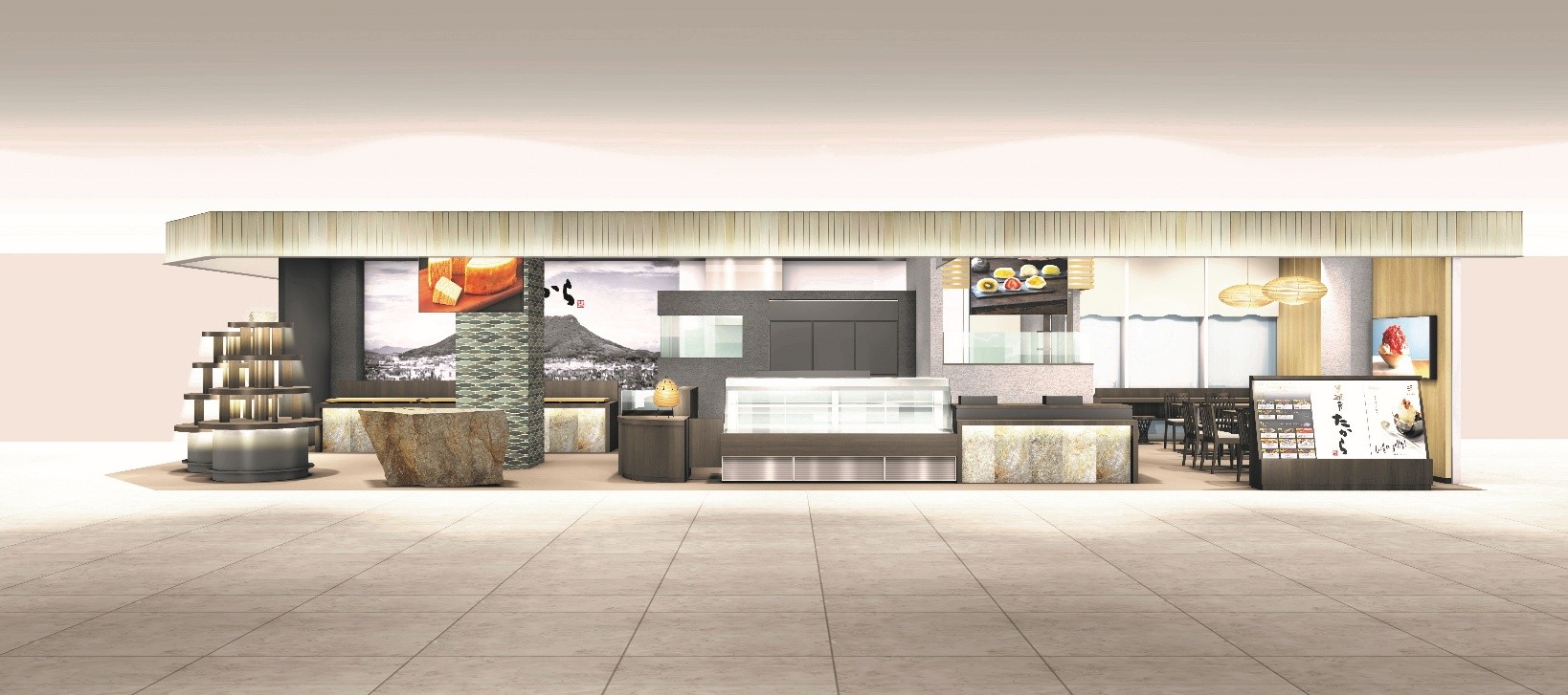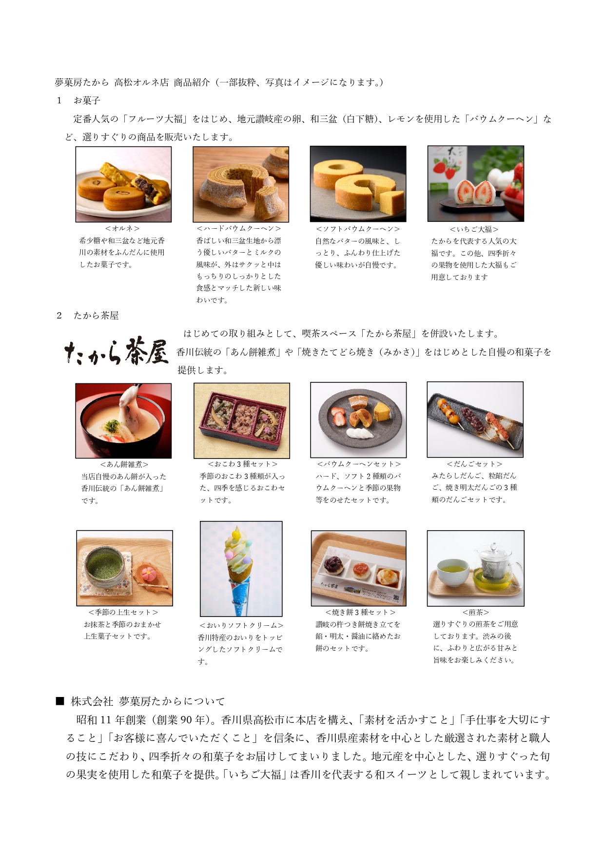 この度、「旅の途中でも、日常の中でも、和菓子を楽しんでいただくこと」をコンセプトに、売り場面積の拡大、店舗デザインの刷新を図るとともに、初めての取り組みとして、喫茶スペース「たから茶屋」を設け、その場で、出来立て、焼き立ての四季折々の和菓子等を提供し、讃岐の和菓子文化の魅力を発信してまいります。
