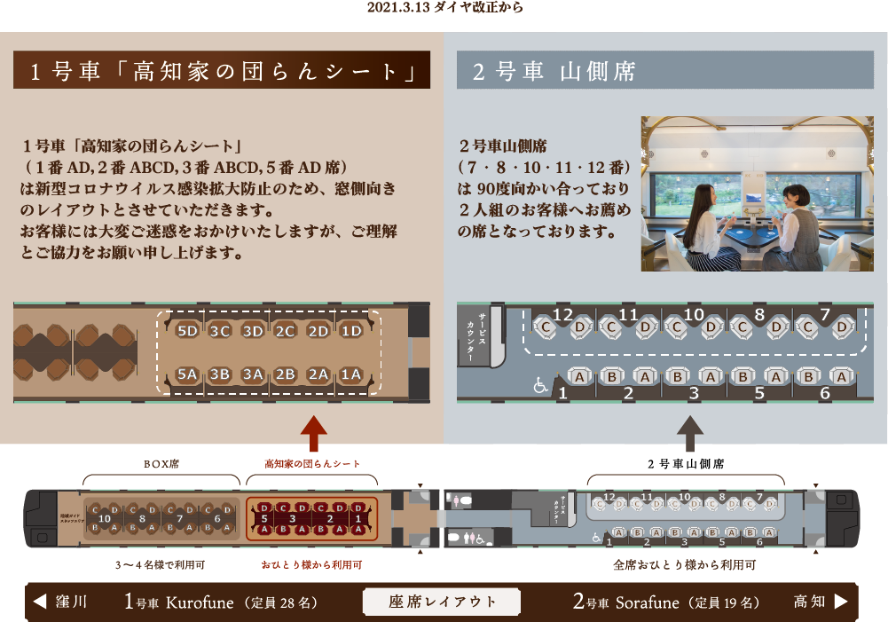 高知を走る22両編成のものがたり列車は、幕末の歴史を象徴する「クロフネ」と、龍馬たちが水平の向こうに夢見た新しい時代の夜明けを連想させる「ソラフネ」、それぞれ異なる色使いで展開。